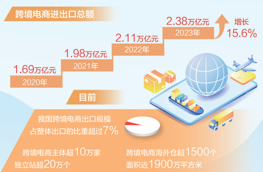 據(jù)海關(guān)測算,2023年,我國跨境電商進(jìn)出口總額2.38萬億元,增長15.6%。其中,出口1.83萬億元,增長19.6%;進(jìn)口5483億元,增長3.9%。跨境電商快速發(fā)展,既滿足了國內(nèi)消費(fèi)者多樣化個(gè)性化需求,又助力我國產(chǎn)品通達(dá)全球,成為外貿(mào)發(fā)展的重要動能。