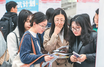 日前,江蘇省2024年春季促就業攻堅行動省級系列招聘會淮安地區專場舉行,來自省內外的220家用人單位,提供涵蓋教育、金融、信息、新能源、新材料等領域近1萬個就業崗位,吸引2000余名高校畢業生現場咨詢應聘。圖為高校畢業生在招聘會上了解崗位信息。