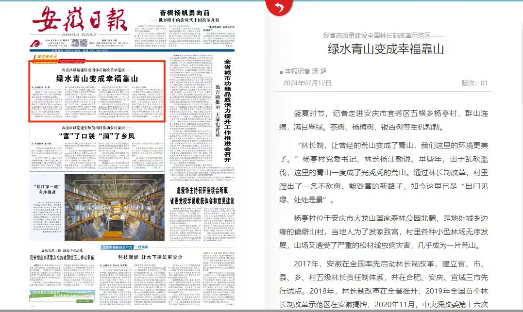 【安徽日報】頭版頭條:我省高質量建設全國林長制改革示范區(qū)——綠水青山變成幸福靠山