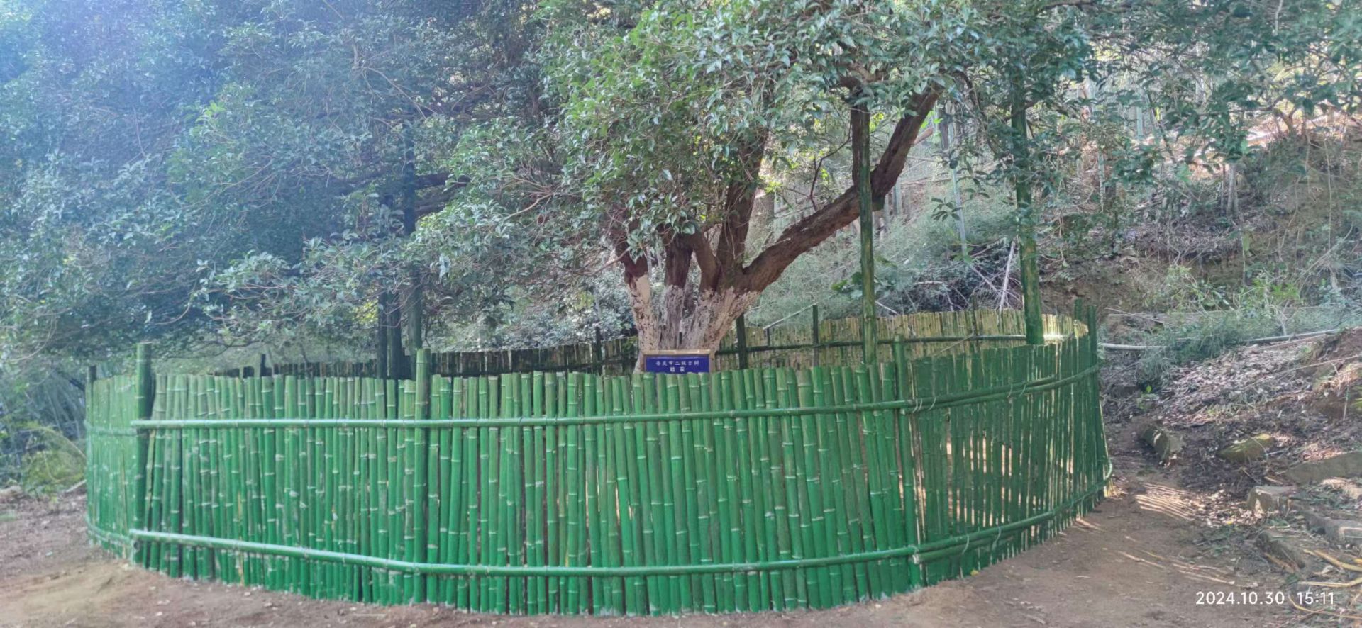 社區(qū)工作人員將古樹周邊環(huán)境清理干凈,并將古樹周圍200平方用竹柵欄圍繞起來,同時設立了管護牌,為了防止大雨或大雪等惡劣天氣影響,用支撐桿托住枝椏,為其提供抗壓能力。