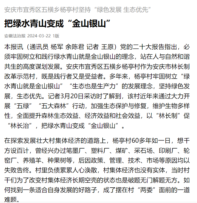 【安徽法制報】安慶市宜秀區五橫鄉楊亭村堅持“綠色發展 生態優先” 把綠水青山變成“金山銀山”