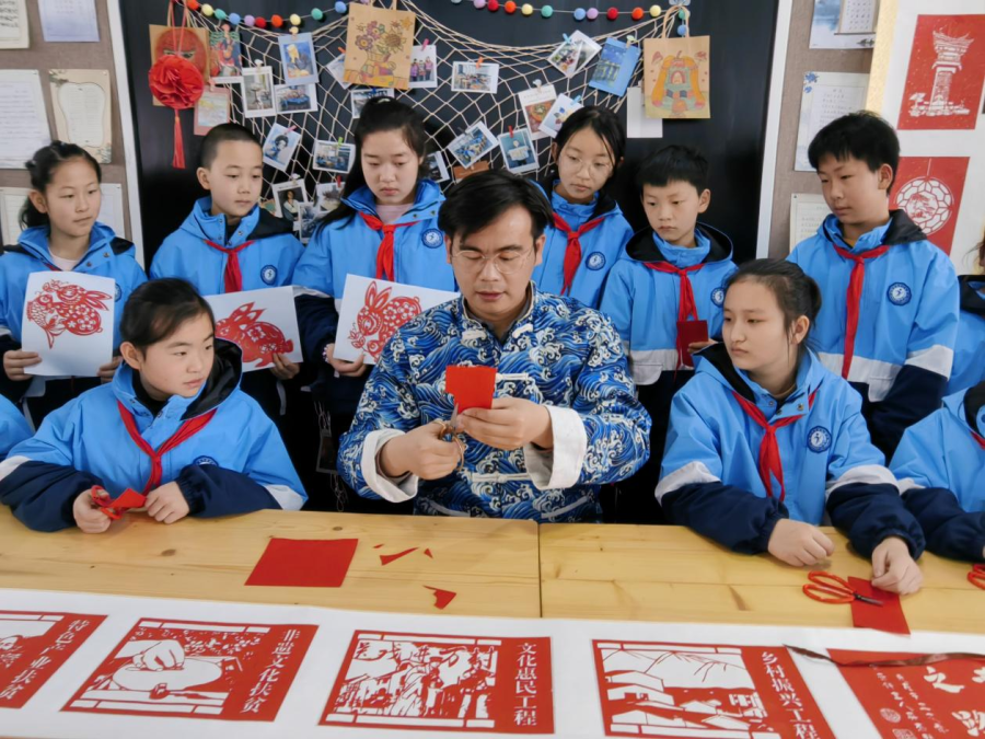 (龍山剪紙代表性傳承人在大龍山中心學校進行剪紙教學)