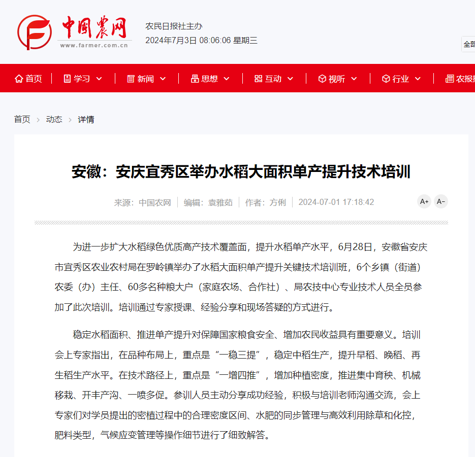 【中國(guó)農(nóng)網(wǎng)】安徽:安慶宜秀區(qū)舉辦水稻大面積單產(chǎn)提升技術(shù)培訓(xùn)
